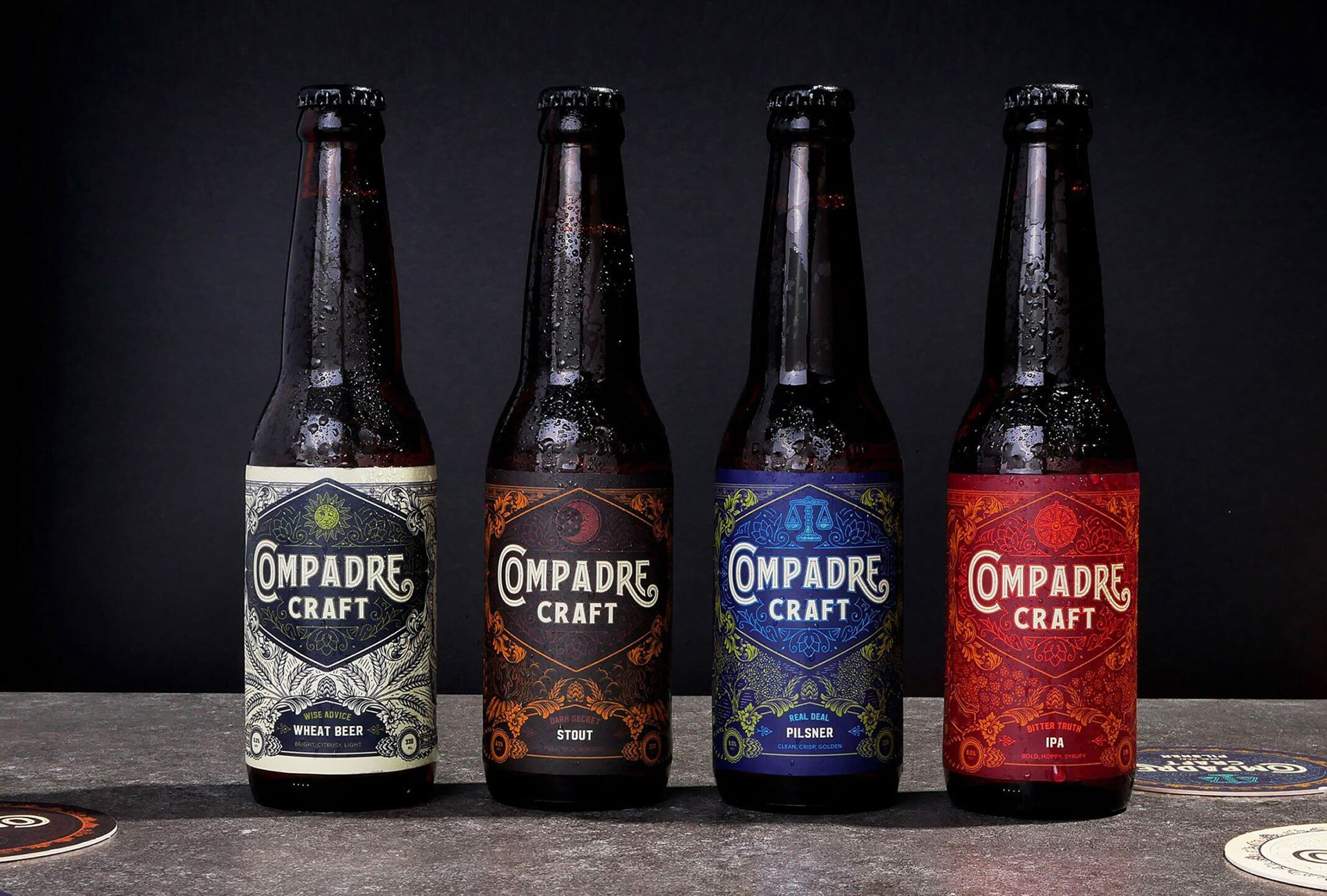 The idea of friendship was at the root of our brand strategy and creative direction, which shaped every single facet of the brand down to the brand name Compadre and its beer variants: Real Deal, Bitter Truth, Wise Advice, and Dark Secret. Our brand system also touched heavily on the packaging which we made sure looked as good as the company you keep.